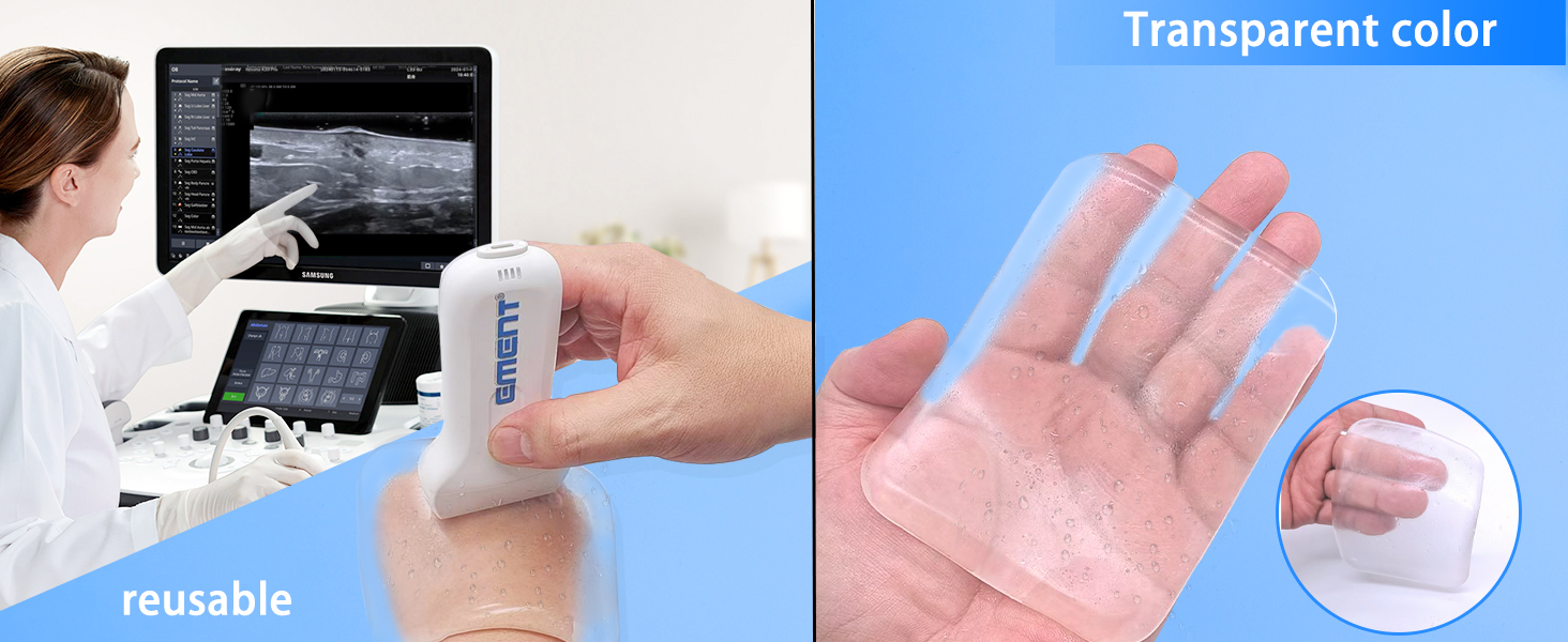 【Reusable Solid Gel Pad】 500+ scan lifespan replaces messy liquid gels—ideal for high-volume ER triage or OB-GYN clinics performing back-to-back ultrasounds. 【Non-Sticky Comfort for Sensitive Exams】 Solid couplant eliminates skin irritation, breast, or pediatric scans—no cold shock or sticky residue on delicate tissues. Conforms to bony contours better than liquid gel, improving probe contact for patients. 【Precision Imaging on Irregular Surfaces】 Maintains consistent acoustic coupling over curved, hairy, or scarred skin—critical for musculoskeletal sonograms and wound assessments. Reduces "air gap" artifacts by 70% vs. traditional gel. 【Simple Wet & Store Maintenance】 Pre/post-use hydration protocol: 1.Rinse under tap water 2. Store damp in sealed case. Pre-wetted surface boosts transducer glide while preventing tissue drag discomfort. 【Turn-Key Solution for Hygienic Workflow】 Swap in 10 seconds between patients—no gel bottles or paper towels needed at mobile imaging units or bedside scans.