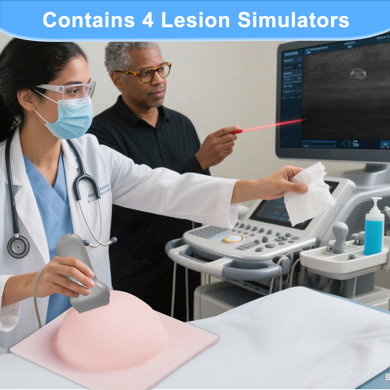 【Use】Ultrasonic breast lesion scanning and exploration, ultrasound breast nodule sweeping practice, ultrasound-guided breast nodule puncture practice, ultrasound-guided breast biopsy puncture practice, ultrasound breast tissue rotary excision practice, for ultrasound medical education and training, avoiding the embarrassment of using a real mannequin 【Realistic Human Skin】 Is shaped to imitate a real breast, using polymer materials equivalent to human tissue, with ultrasonic imaging equivalent to human tissue density. Realistic feel, better practicing effect 【Clear Ultrasound Images】Contains 1cm diameter hypoechoic nodal tissue, 1.5cm hypoechoic malignant infiltrative lesion tissue, respectively located in the breast in different directions, different spatial distribution, suitable for breast lesion tissue puncture biopsy small lesion localization. 【Can be practiced repeatedly】Adopts polymer material equivalent to human tissue, feel real and no odor. The product is molded in one piece, please use with ultrasound coupling agent and probe, can be used with biopsy needle or puncture needle training, resistant to 1000 times puncture use, can automatically repair the needle channel after puncture. 【Customizable]】Ultrasound imaging is equivalent to the density of human tissue and supports customization of various lesion cases.