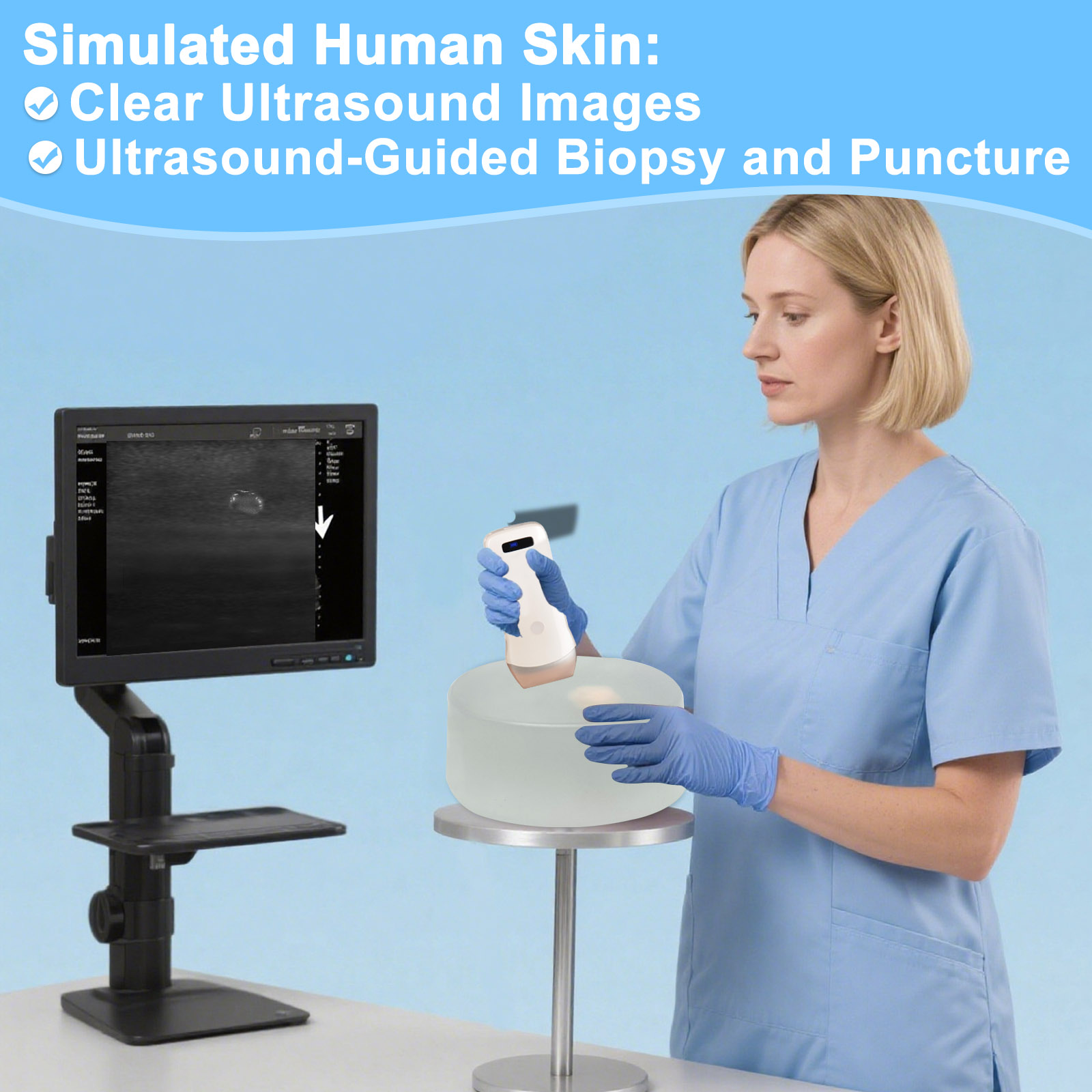 【Use】Ultrasonic breast lesion scanning and exploration, ultrasound breast nodule sweeping practice, ultrasound-guided breast nodule puncture practice, ultrasound-guided breast biopsy puncture practice, ultrasound breast tissue rotary excision practice, for ultrasound medical education and training, avoiding the embarrassment of using a real mannequin 【Realistic Human Skin】 Is shaped to imitate a real breast, using polymer materials equivalent to human tissue, with ultrasonic imaging equivalent to human tissue density. Realistic feel, better practicing effect 【Clear Ultrasound Images】Contains 1cm diameter hypoechoic nodal tissue, 1.5cm hypoechoic malignant infiltrative lesion tissue, respectively located in the breast in different directions, different spatial distribution, suitable for breast lesion tissue puncture biopsy small lesion localization. 【Can be practiced repeatedly】Adopts polymer material equivalent to human tissue, feel real and no odor. The product is molded in one piece, please use with ultrasound coupling agent and probe, can be used with biopsy needle or puncture needle training, resistant to 1000 times puncture use, can automatically repair the needle channel after puncture. 【Customizable]】Ultrasound imaging is equivalent to the density of human tissue and supports customization of various lesion cases.